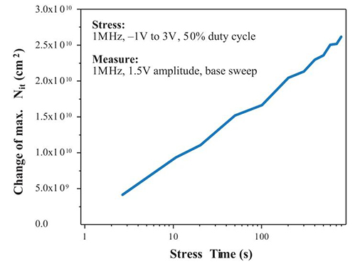 新材料和结构的使用促使人们更加关注动态可靠性测试。在可靠性测试器件中引入脉冲或交流应力,以及在测量过程中使用脉冲来表征应力引起的界面退化,成为当前研究的热点。研究发现,电压应力随时间导致的界面退化或界面陷阱密度增加,是HCI、NBTI等器件可靠性问题以及高κ材料可靠性的关键因素。电荷泵技术在现有的直流表征测试中添加界面陷阱监测,对于理解这些新的可靠性问题非常有用。