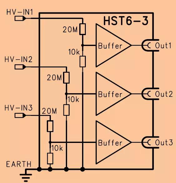 HST分压器采用高精密电阻分压及复杂的模拟信号处理技术,以此保证较大的精度和带宽,分压原理如下图示: