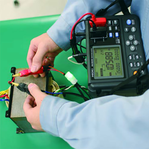 针对温度相关的测量需求,日置RM3548电阻计具备温度换算功能和间隔测量功能,尤其适用于温度上升试验。在电机马达或变压器评估中,需要确认通电后的最高上升温度,工作人员可按照以下步骤操作:首先,在电机马达、变压器完全与室温融合时,测量通电前的电阻值(R1)及周围温度(t1)并输入主机;接着,将测试线从被测物上取下;然后,在通电OFF后,重新给被测物接上测试线,使用间隔存储功能测量并记录每隔一段时间的温度上升值(Δt1~Δtn);最后,结合测得的温度数据(Δt1~Δtn)推算最高温度上升值(Δt)。需要注意的是,温度换算功能无法与温度补偿功能、长度换算功能同时使用。