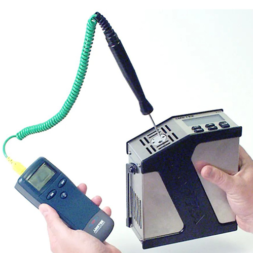 AMETEK ETC400A手持式干体式校准仪基于干体式校准技术(干井炉技术)研发,核心原理是通过精准控制内置均热块的温度,为被校准器件提供稳定均匀的中高温场,实现温度示值的比对校准。与需液体介质的液浴校准仪不同,ETC400A依托固体均热块的高效热传导特性,规避了液体泄漏风险,更适配现场移动作业。 其校准流程可分为四步:首先,根据被校准传感器直径选择预设的校准孔——ETC400A采用套管固定内置设计,订货时可预先选择2mm、3mm、4mm等公制或1/16in、1/8in等英制规格的校准孔,无需现场更换套管;其次,通过面板上下箭头键设定目标温度,仪器内置的高效加热单元启动工作,依托高密度电阻加热丝快速升温,33℃至200℃仅需2分钟;随后,控温系统通过内置铂电阻传感器实时监测均热块温度,结合PID算法进行动态微调,使温场稳定性控制在0.15℃以内,稳定指示器通过声光提示校准就绪;最后,将被校准器件插入110mm深的校准孔,待示值稳定后,对比ETC400A的标准温度与器件示值,计算误差并完成校准。这种原理设计使AMETEK ETC400A手持式干体式校准仪具备两大优势:一是固定套管与多直径校准孔的组合,既保障了校准孔密封性与热稳定性,又适配不同规格传感器;二是超快加热单元配合高导热均热块,实现中高温段的快速温场建立,大幅缩短校准等待时间。